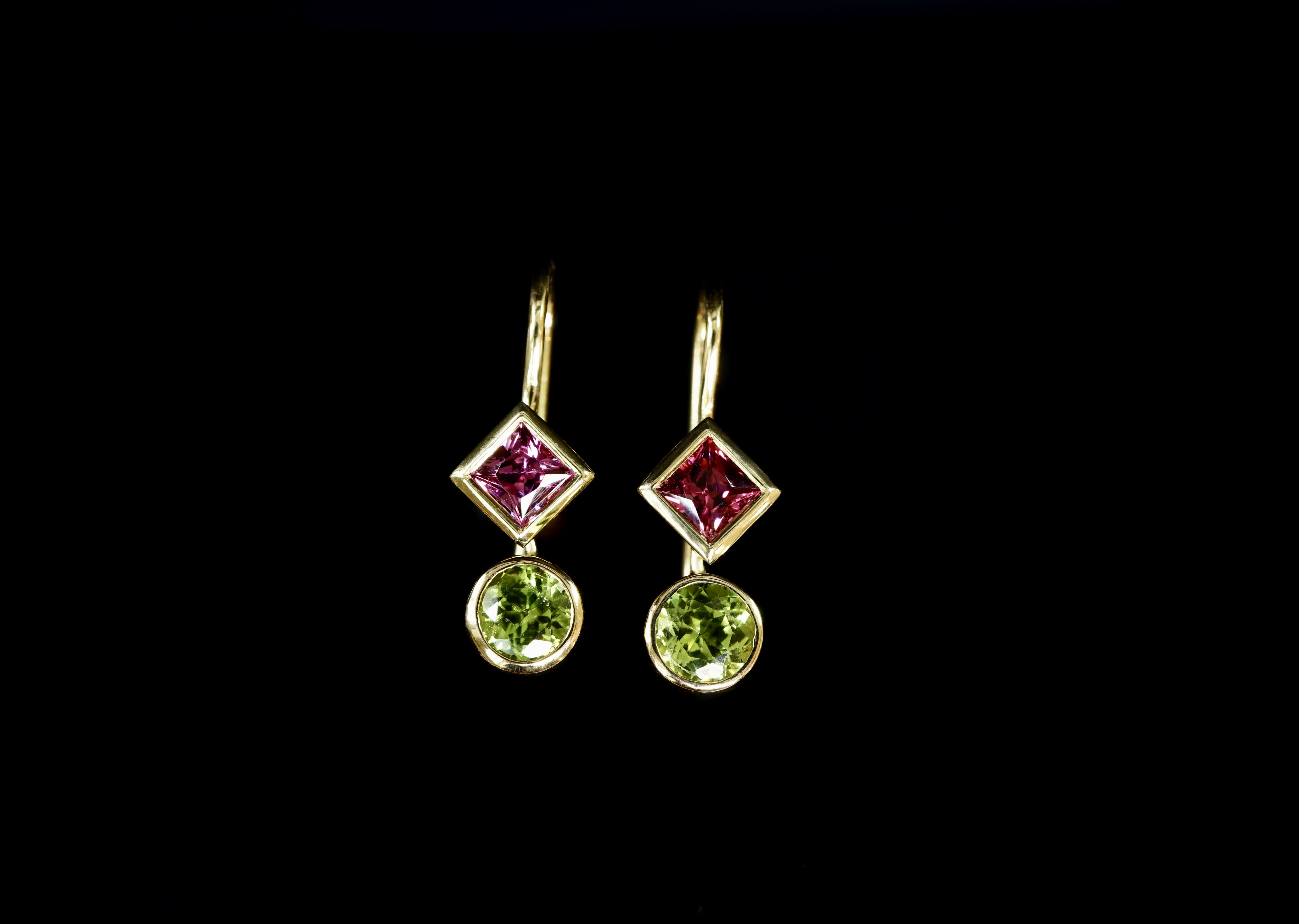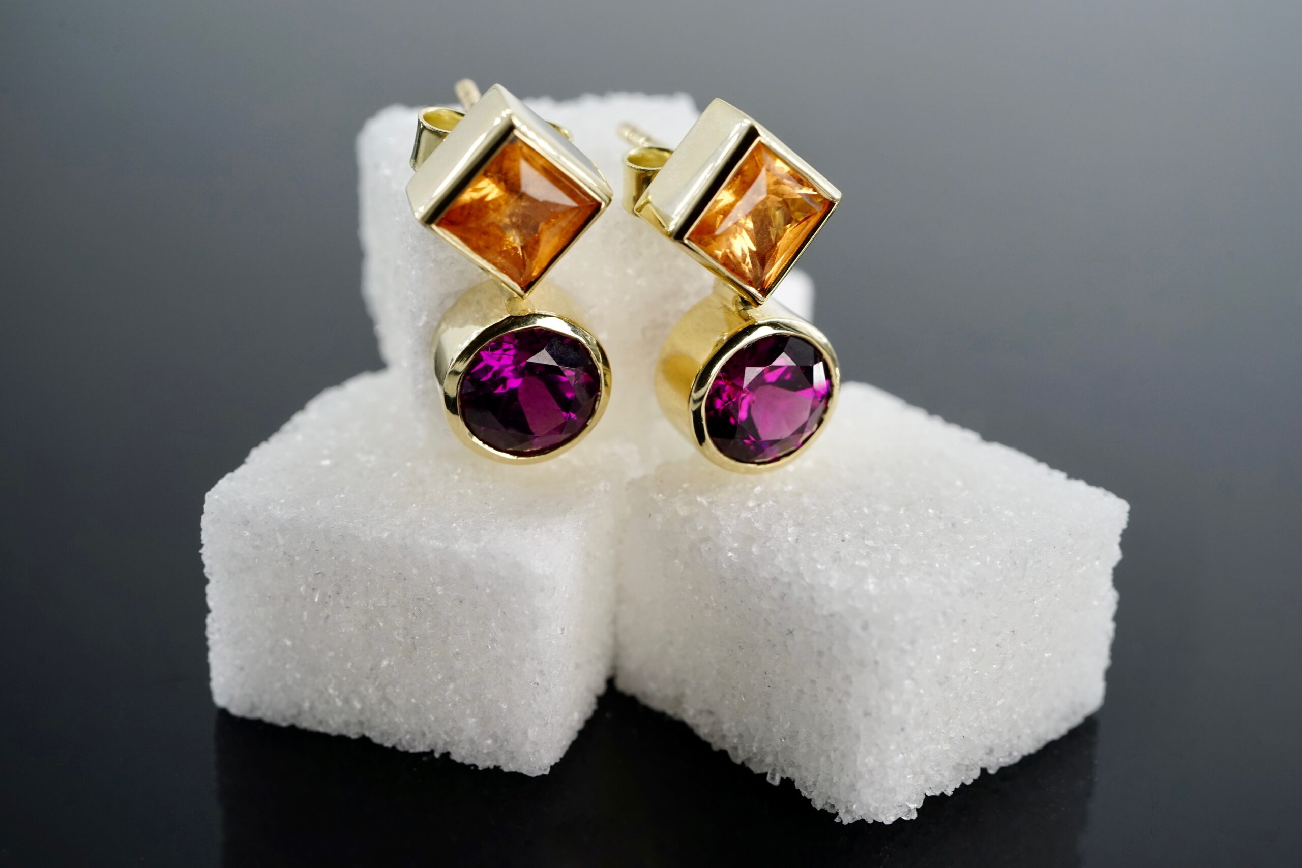 „Candy“-Ohrringe mit Mandarin-Granaten und Royal-Purple Granaten in 585er Gelb-Gold; 1250.- €
