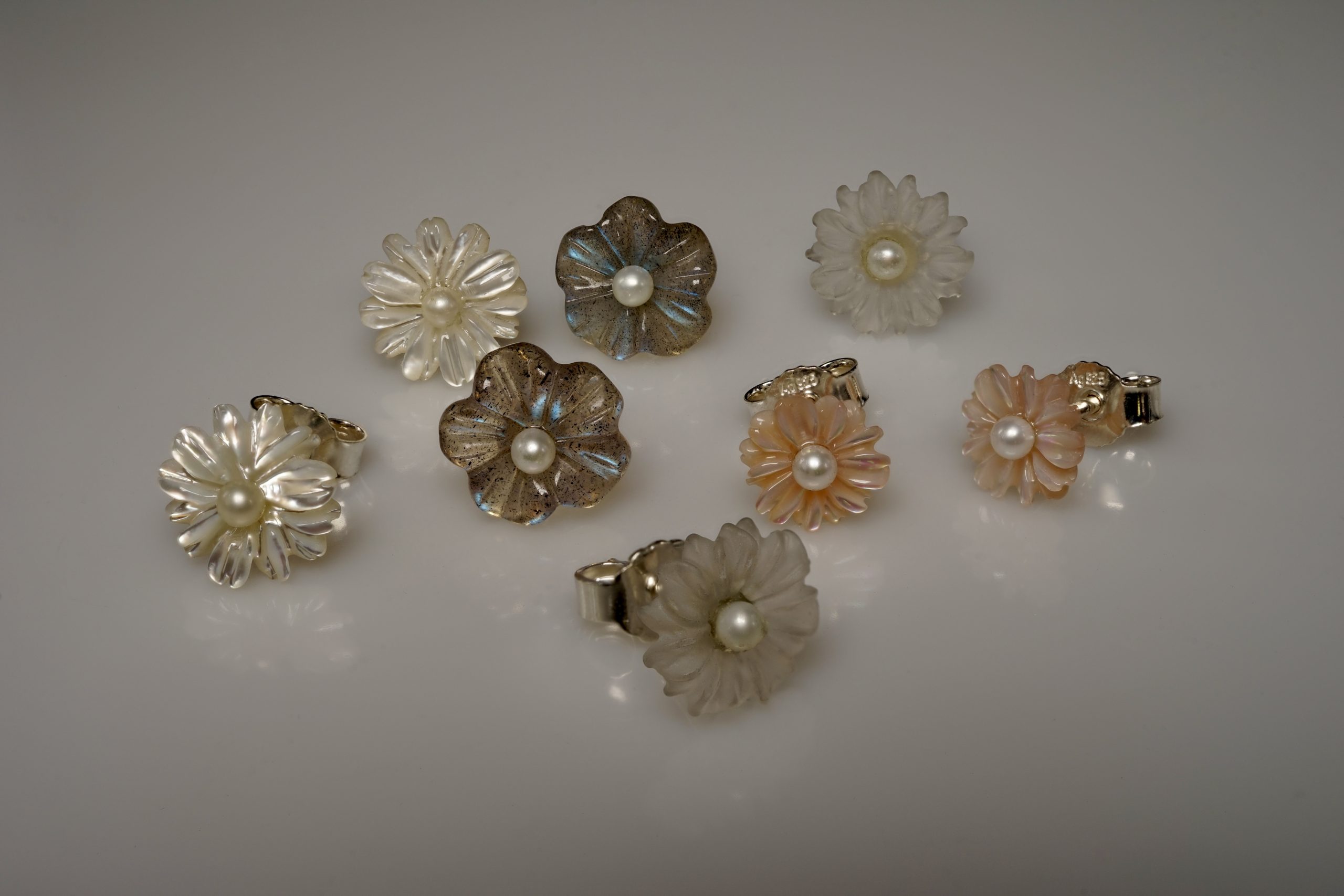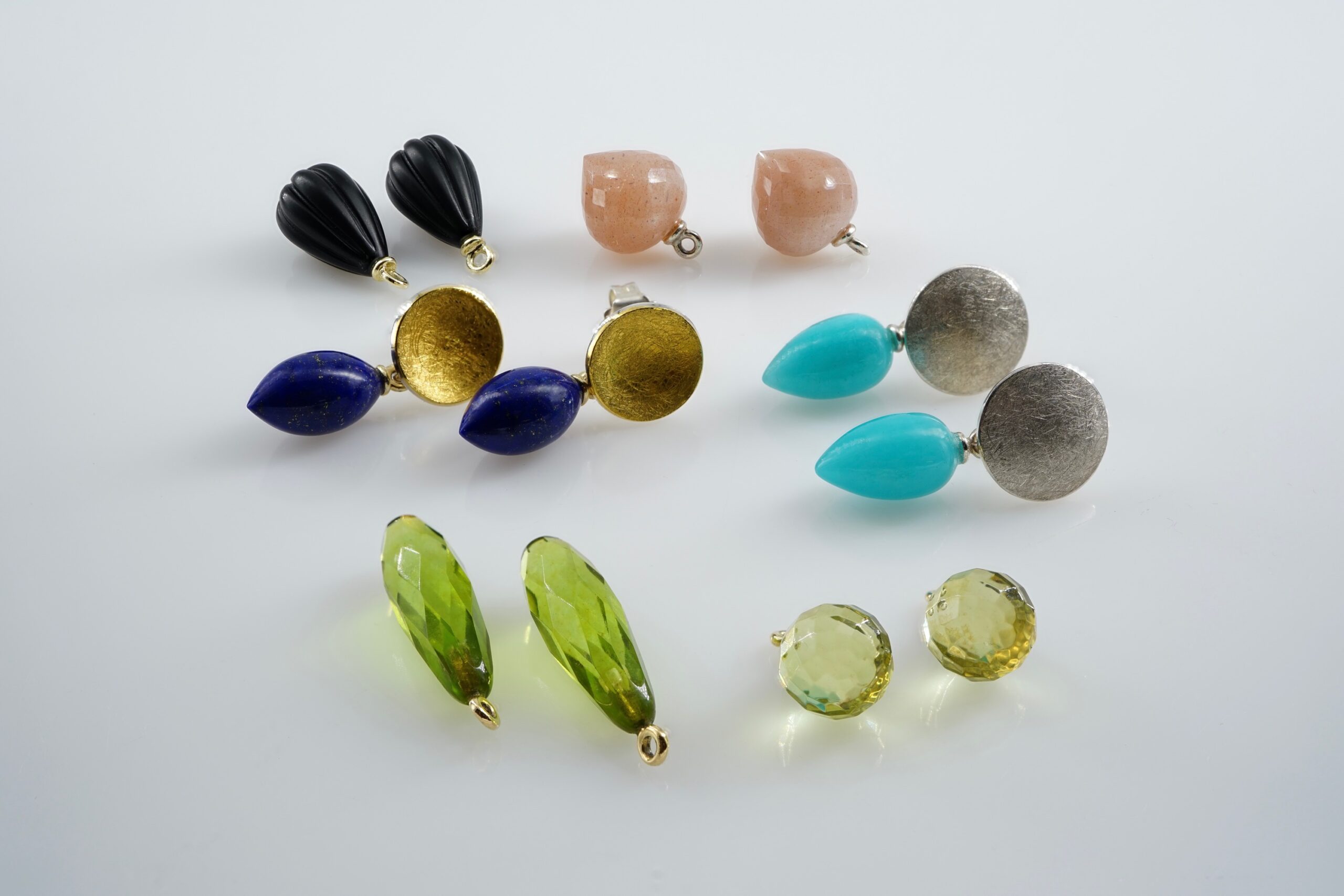 Ohrstecker mit Häkchen zum Wechseln in Silber/Fein-Gold (190.- €) oder Silber (100.- €); Wechselanhänger in unterschiedlichen Materialien; hier in Lapis-Lazuli, Citrin, grünem Bernstein, Onyx, Amazonit und Mondstein