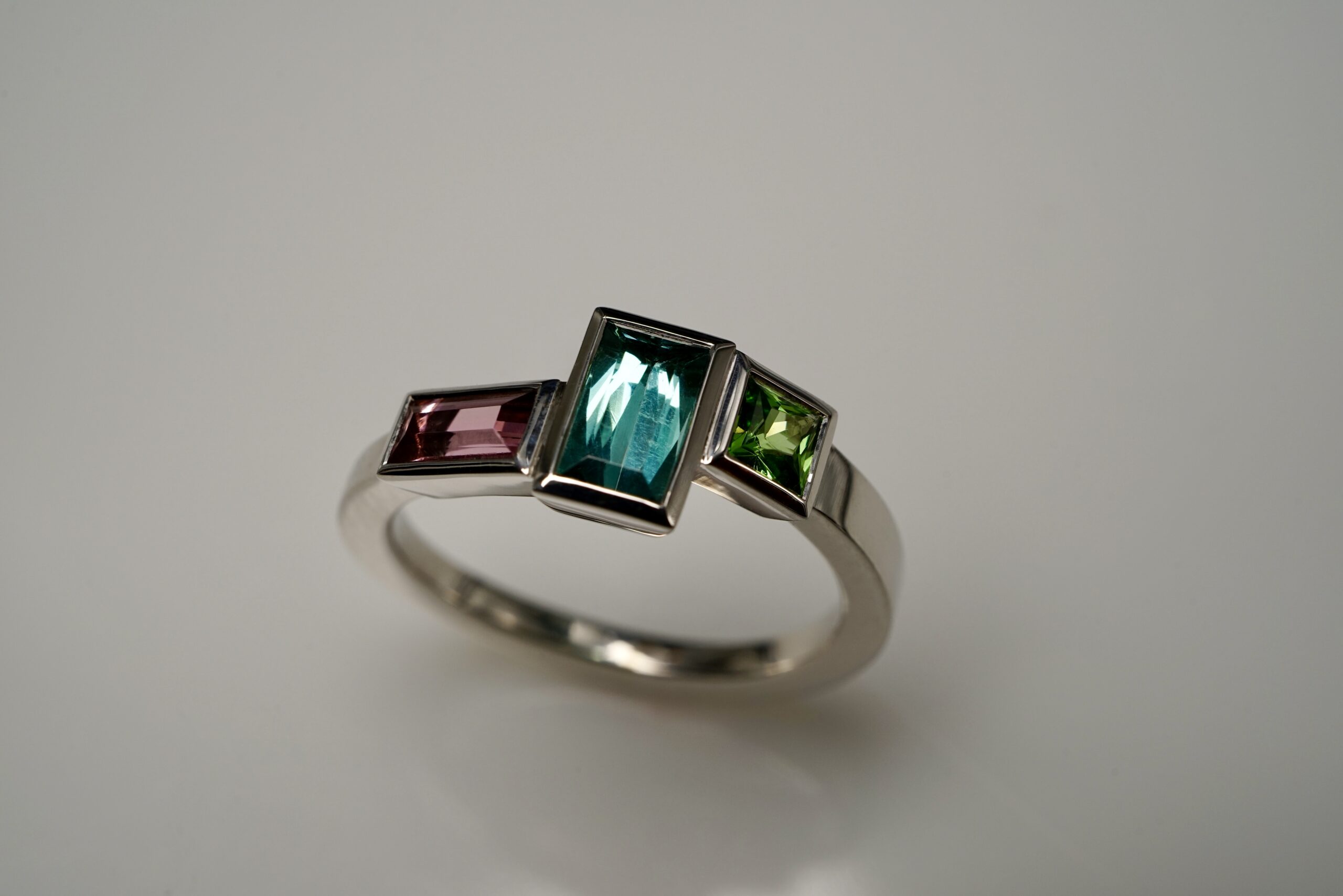 Ring links: Turmalin in sea-foam; Mitte: Turmalin in rose; Rechts: Tsavorith in 585er Weiß-Gold; 1395.- € (verkaut)