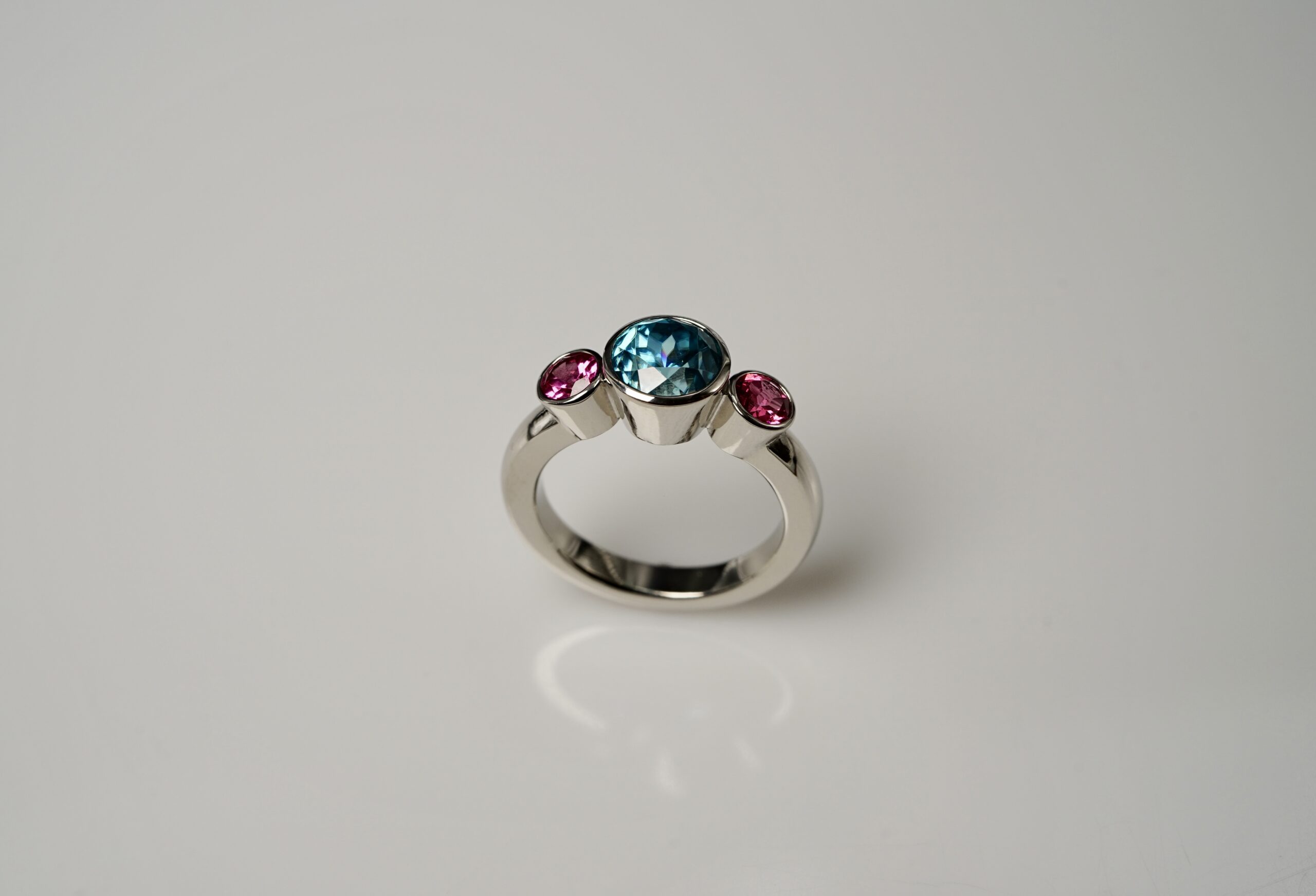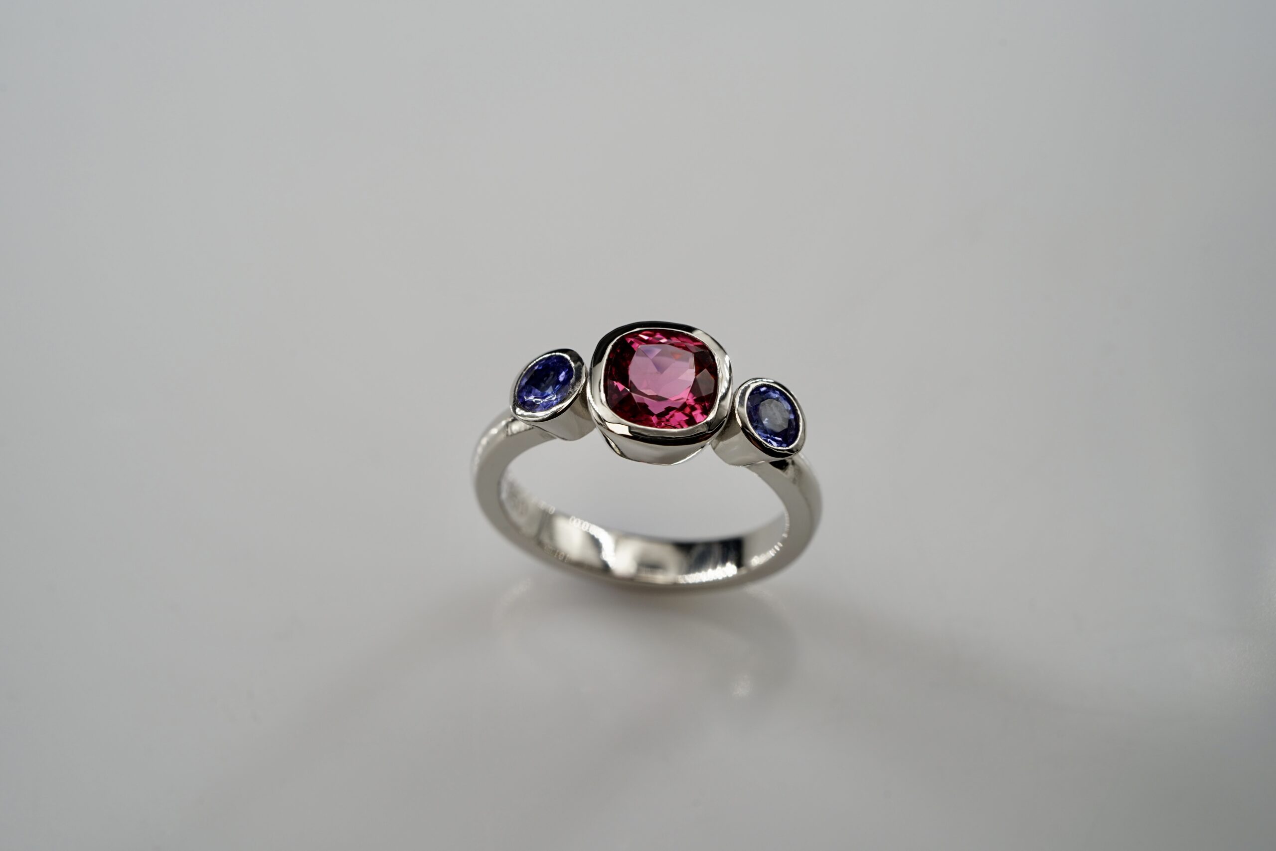 „Candy“-Ring mit zwei Tansanite 0,52 ct. und einem Turmalin hotpink 1,50 ct. in 950er Platin; 1795.- €