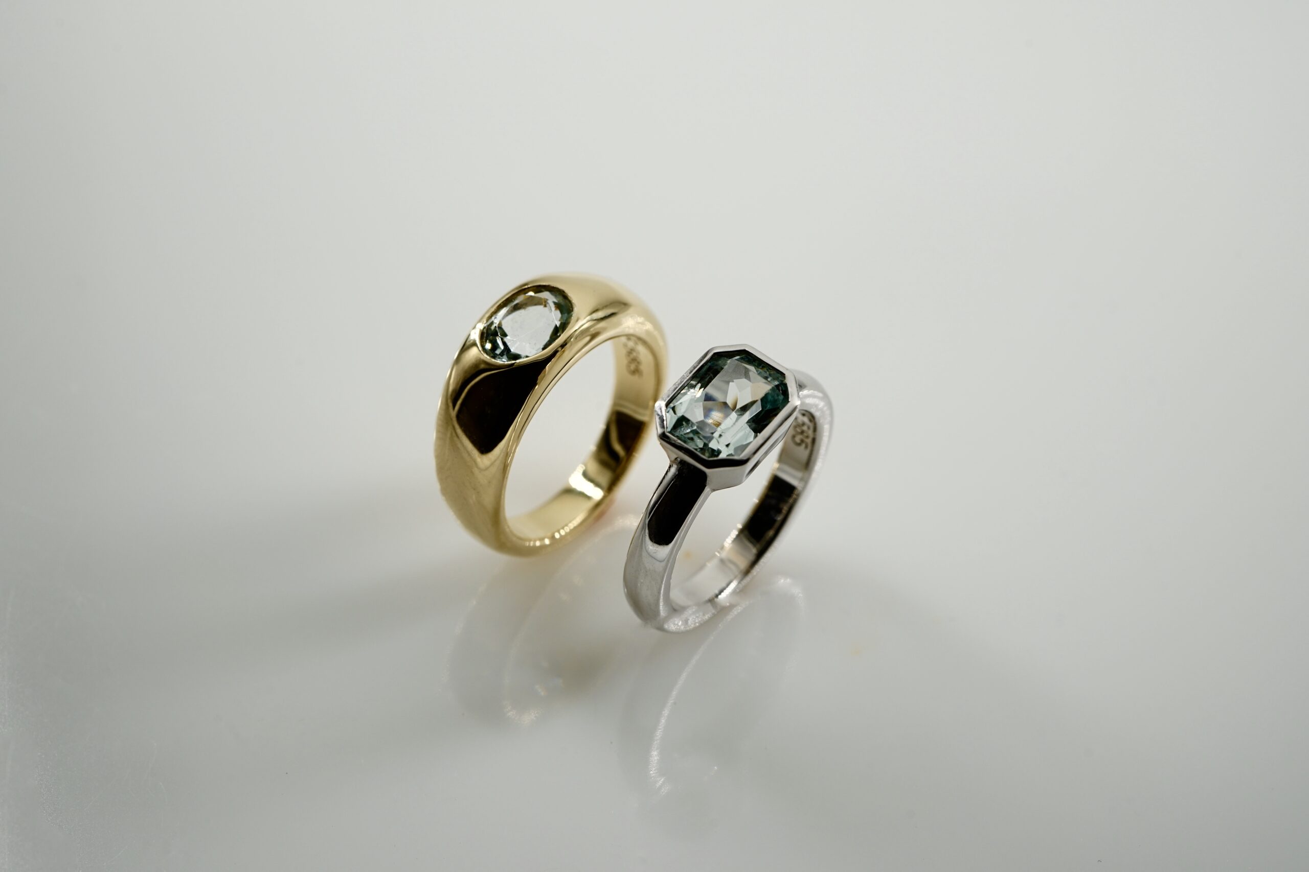 Bandring in 585er Gelb-Gold mit Aquamarin; 1440.- € und Ring in 585er Weiß-Gold mit Aquamarin; 1615.- €